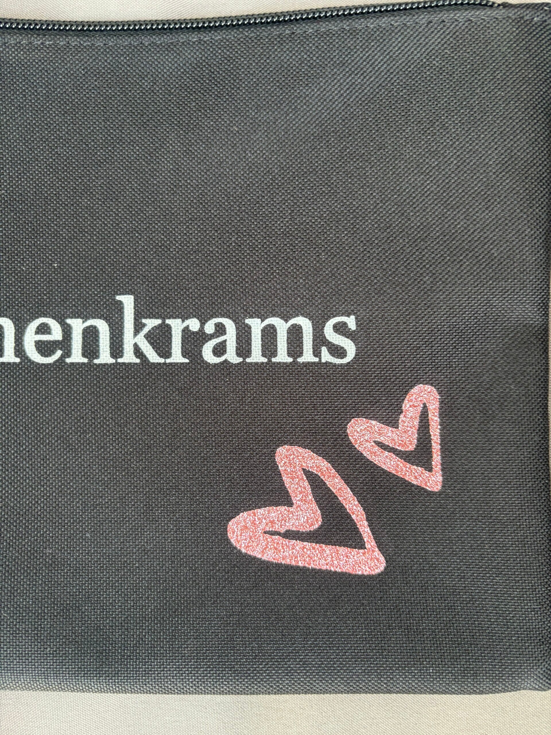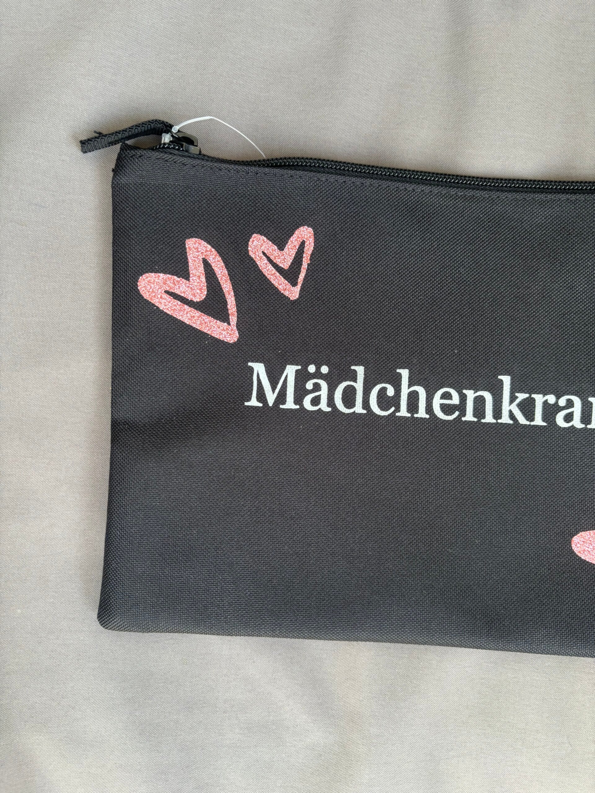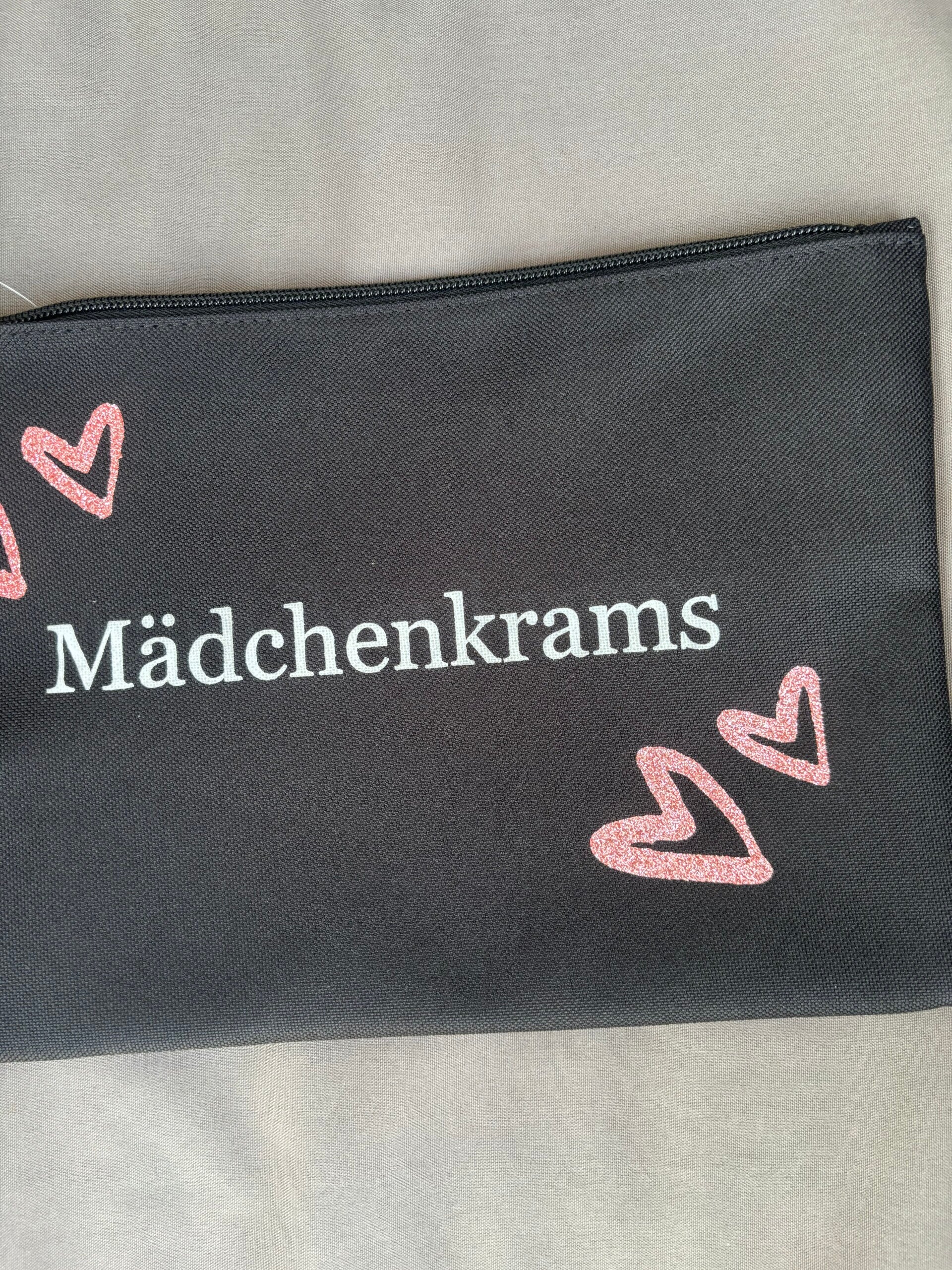 Diese süße Kosmetiktasche mit dem Schriftzug „Mädchenkrams“ und glitzernden Herzchen ist perfekt für alles, was man einfach dabeihaben muss – ob Lippenpflege, Haargummis oder kleine Schätze. 🩷