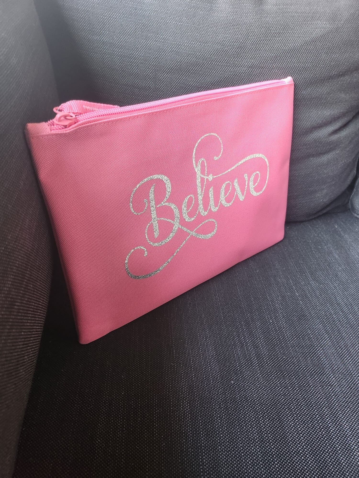 Diese pinke Kosmetiktasche mit dem schimmernden Schriftzug Believe ist nicht nur ein stylisches Accessoire, sondern auch ein täglicher Reminder an Selbstvertrauen und Positivität. Perfekt geeignet als Schminktäschchen, Aufbewahrung für kleine Alltagshelfer oder als liebevolles Geschenk für deine beste Freundin, Mama oder Kollegin.