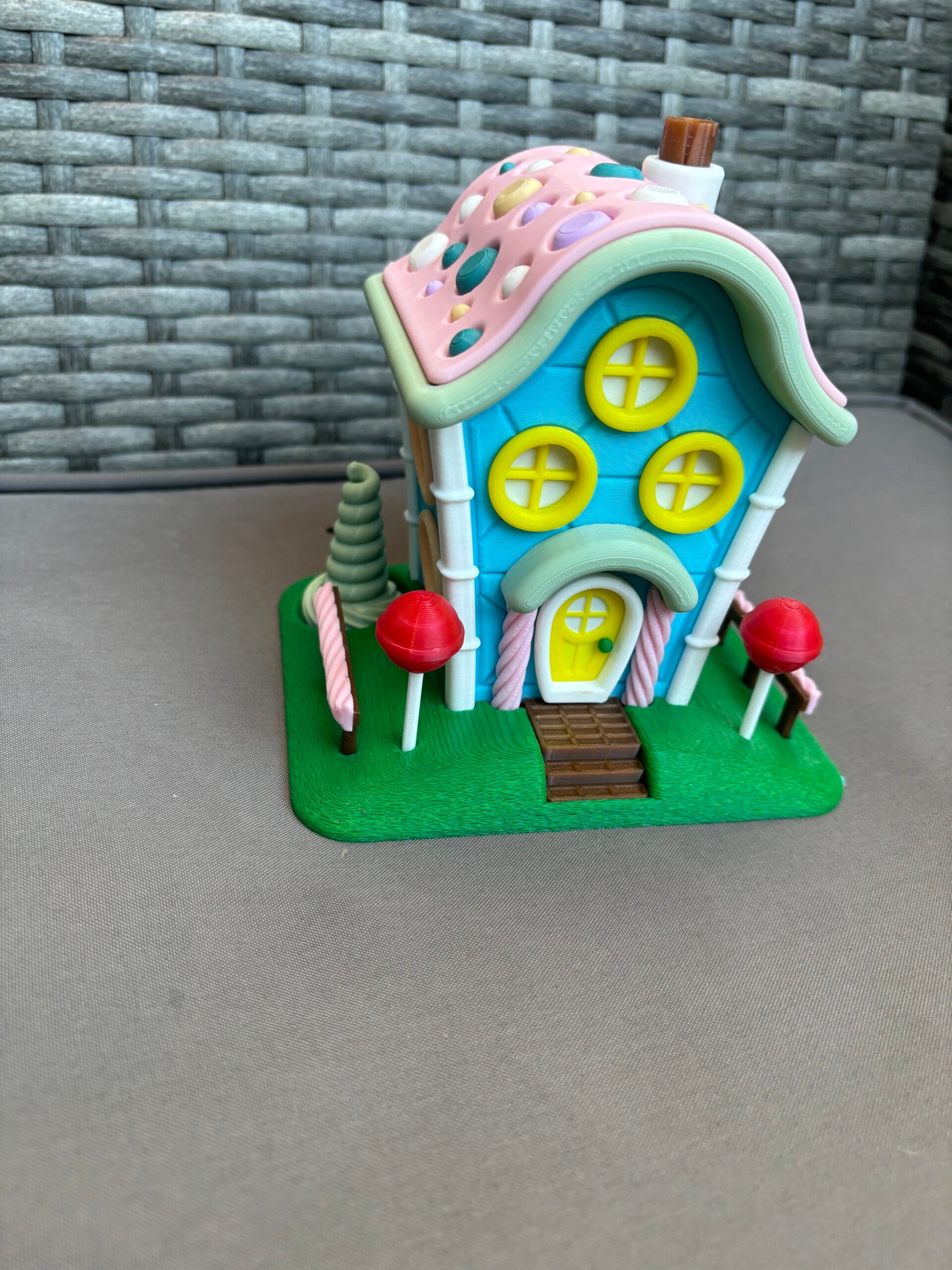 Dieses bunte kleine Märchenhaus sieht aus wie aus einer Zuckerwelt! Mit seinen süßen Details wie Lollis, Zuckerstangen und dem verspielten Dach bringt es sofort gute Laune in dein Zuhause.