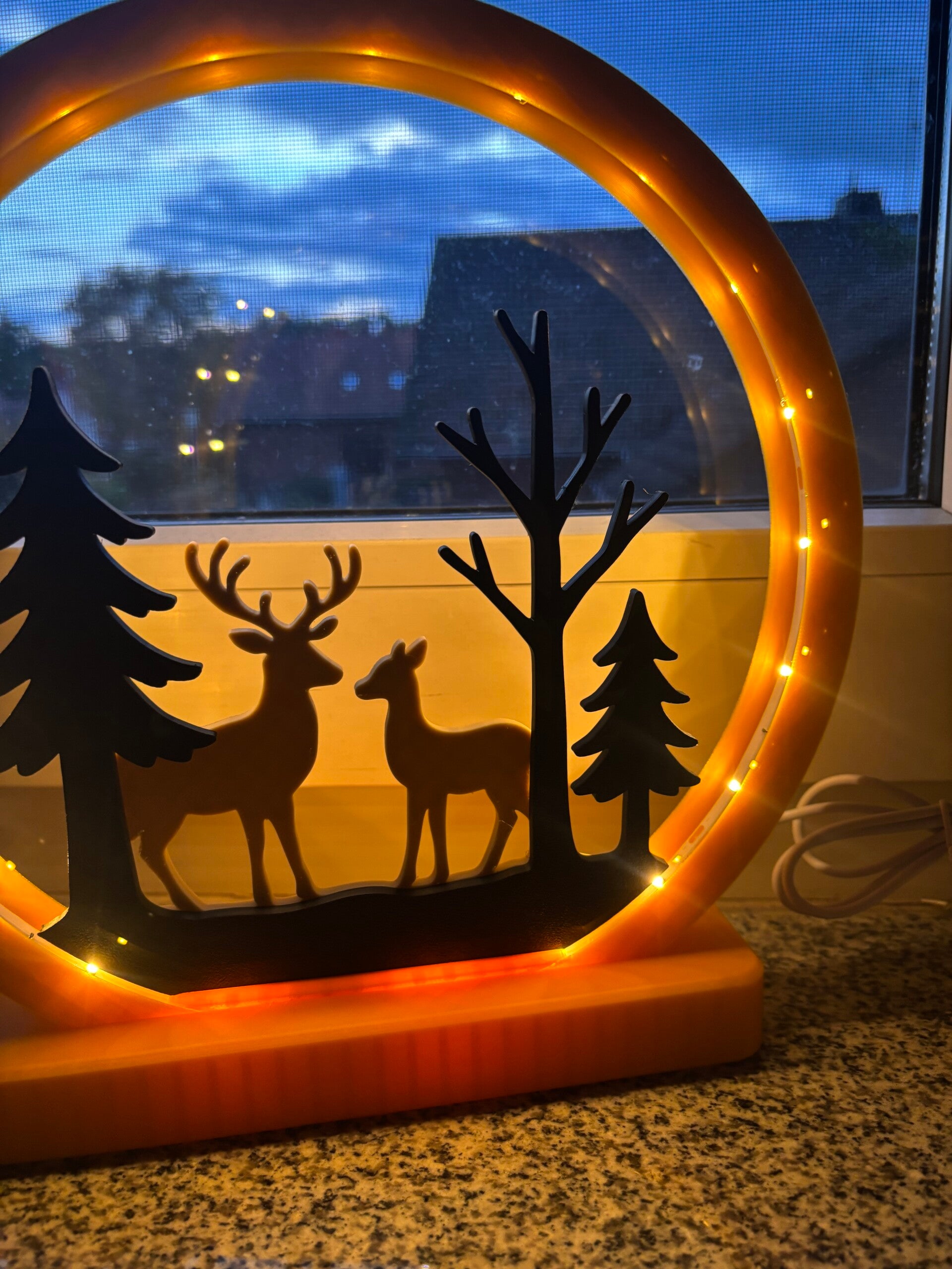 Dieser liebevoll gefertigte Lichtring mit Wald- und Rehmotiv bringt sofort winterliche Gemütlichkeit in dein Zuhause.