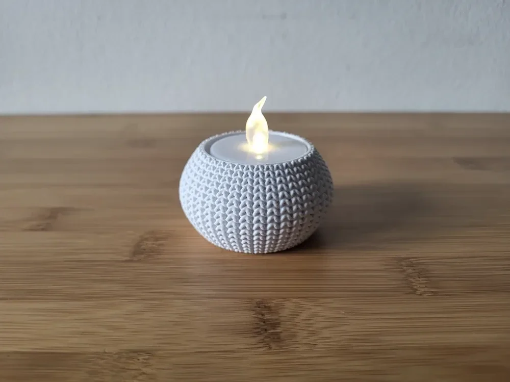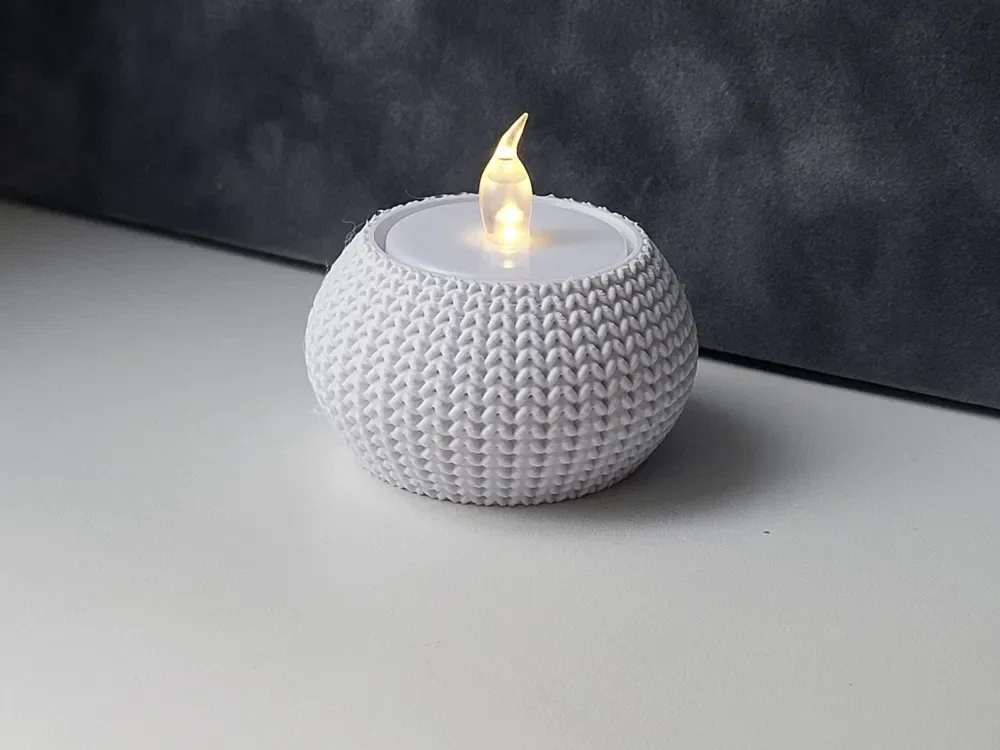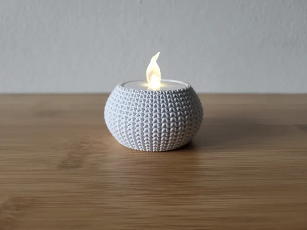 Dieser wunderschöne Teelichthalter in Strickoptik wird im 3D-Druck gefertigt und sieht aus wie liebevoll gehäkelt – nur viel langlebiger.
