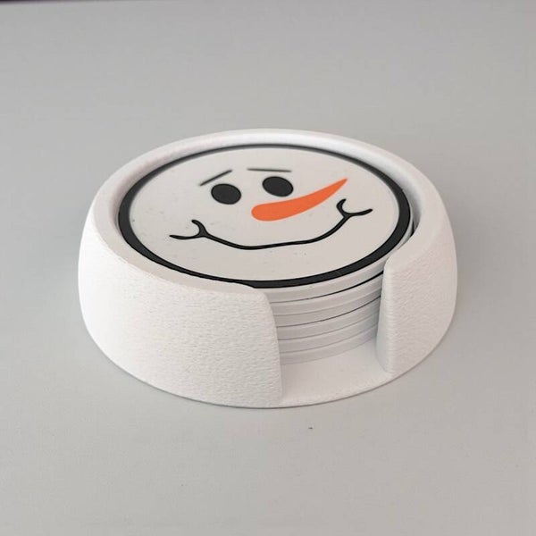 Jeder Untersetzer zeigt ein anderes fröhliches Schneemann-Gesicht – ideal, um Gästen ein Lächeln ins Gesicht zu zaubern. Dank der passenden Halterung bleiben alle Untersetzer ordentlich an ihrem Platz und sind jederzeit griffbereit.